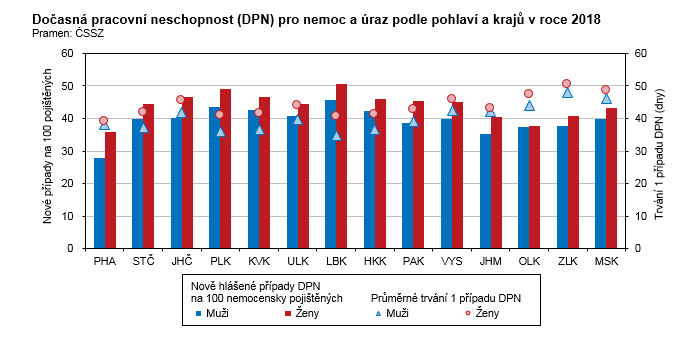 Dočasná pracovní neschopnost (DPN) pro nemoc a úraz podle pohlaví a krajů v roce 2018