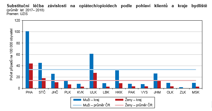 Substituční léčba závislosti na opiátech/opioidech podle pohlaví klientů a kraje bydliště