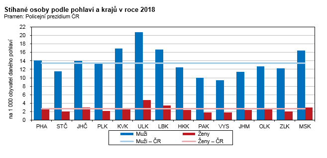 Stíhané osoby podle pohlaví a krajů v roce 2018