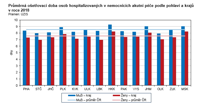 Průměrná ošetřovací doba osob hospitalizovaných v nemocnicích akutní péče podle pohlaví a krajů v roce 2018