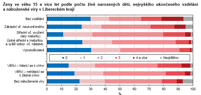 Ženy ve věku 15 a více let podle počtu živě narozených dětí, nejvyššího ukončeného vzdělání a náboženské víry v Libereckém kraji