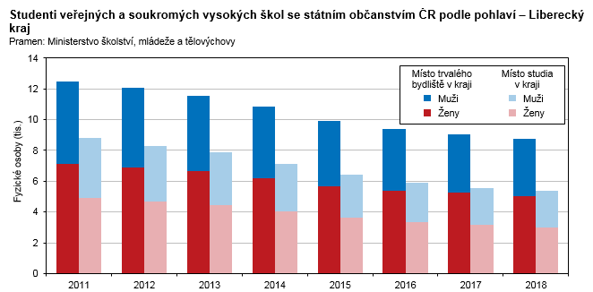 Studenti veřejných a soukromých vysokých škol se státním občanstvím ČR podle pohlaví – Liberecký kraj