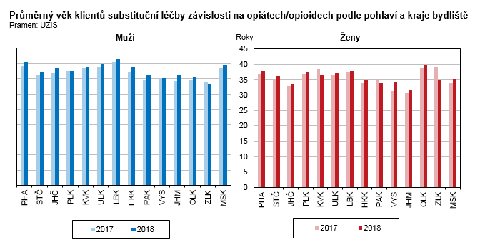 Průměrný věk klientů substituční léčby závislosti na opiátech/opioidech podle pohlaví a kraje bydliště