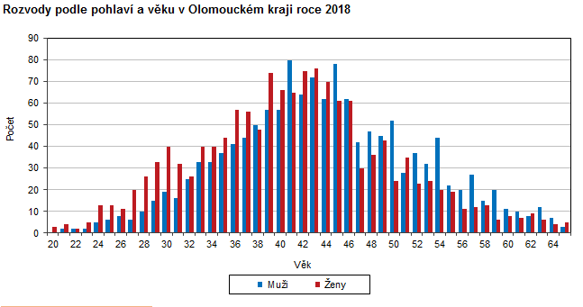 Rozvody podle pohlaví a věku v Olomouckém kraji v roce 2018