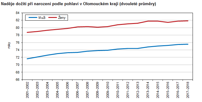 Naděje dožití při narození podle pohlaví v Olomouckém kraji