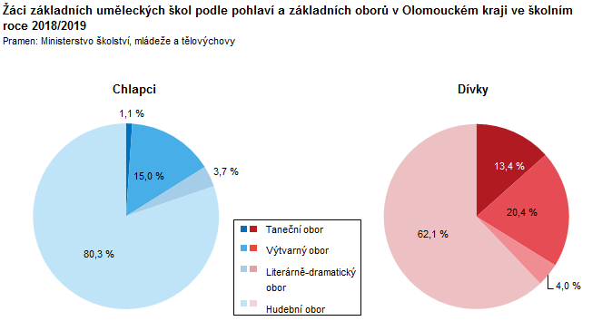 Žáci základních uměleckých škol podle pohlaví a základních oborů v Olomouckém kraji ve školním roce 2018/2019