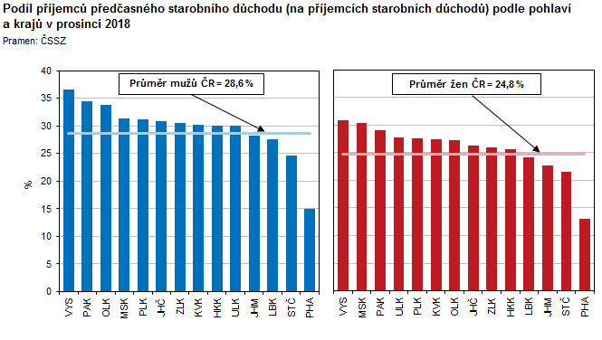 Podíl příjemců předčasného starobního důchodu (na příjemcích starobních důchodů) podle pohlaví a krajů v prosinci 2018
