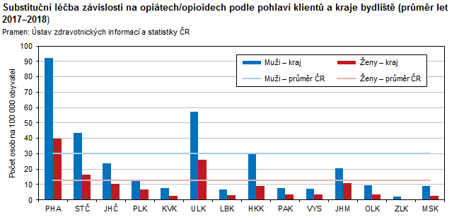 Substituční léčba závislosti na opiátech/opioidech podle pohlaví klientů a kraje bydliště