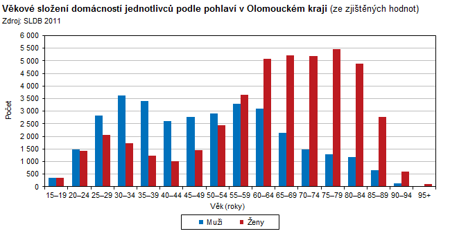 Věkové složení domácností jednotlivců podle pohlaví v Olomouckém kraji