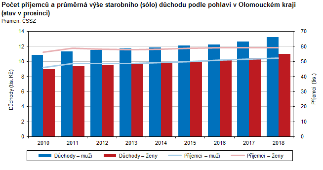 Počet příjemců a průměrná výše starobního (sólo) důchodu podle pohlaví v Olomouckém kraji (stav v prosinci)