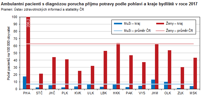 Ambulantní pacienti s diagnózou porucha příjmu potravy podle pohlaví a kraje bydliště v roce 2017