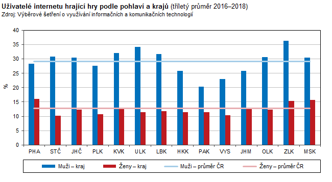 Uživatelé internetu hrající hry podle pohlaví a krajů
