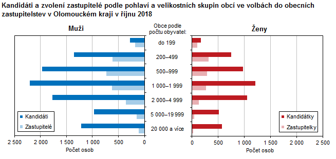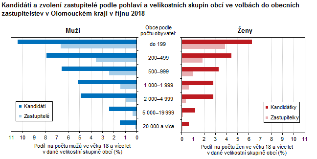 Kandidáti a zvolení zastupitelé podle pohlaví a velikostních skupin obcí ve volbách do obecních zastupitelstev v Olomouckém kraji v říjnu 2018 (podíly na počtu obyvatel)