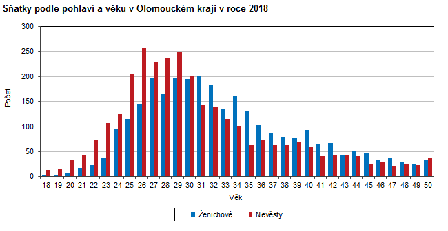 Sňatky podle pohlaví a věku v Olomouckém kraji v roce 2018