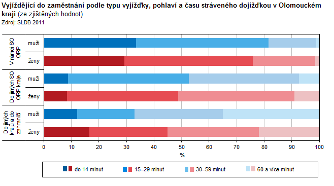 Vyjíždějící do zaměstnání podle typu vyjížďky, pohlaví a času stráveného dojížďkou v Olomouckém kraji