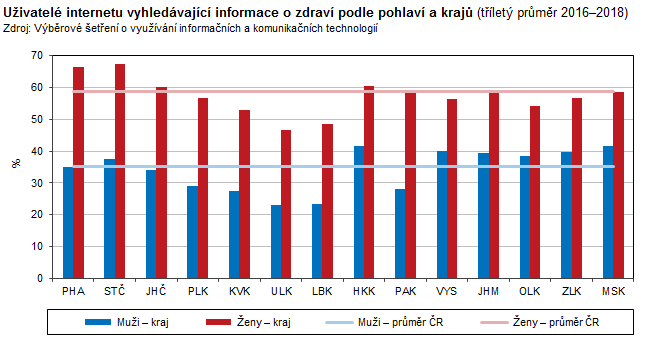 Uživatelé internetu vyhledávající informace o zdraví podle pohlaví a krajů