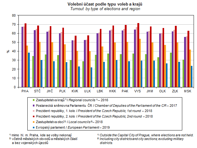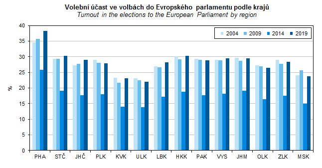 Graf 46. Volební účast ve volbách do Evropského parlamentu podle krajů