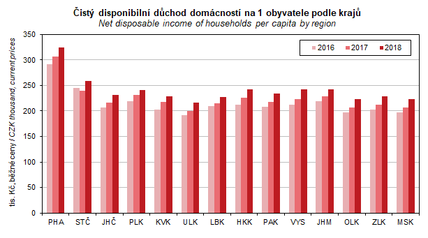 Graf 14. Čistý disponibilní důchod domácností na 1 obyvatele podle krajů