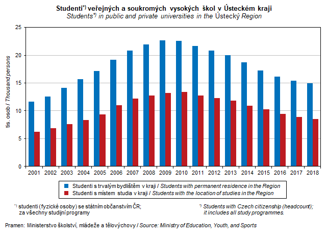 Graf 41. Studenti veřejných a soukromých vysokých škol v Ústeckém kraji