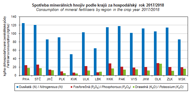 Graf 28. Spotřeba minerálních hnojiv podle krajů za hospodářský rok 2017/2018