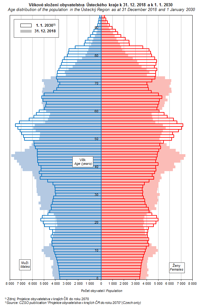 Graf 10. Věkové složení obyvatelstva Ústeckého kraje k 31. 12. 2018 a k 1. 1. 2030
