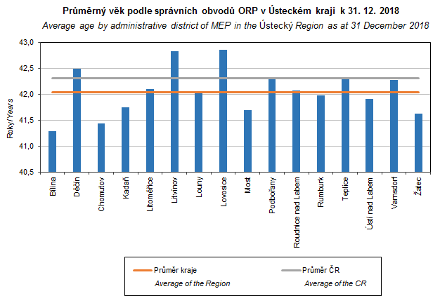 Graf 48. Průměrný věk podle správních obvodů ORP v Ústeckém kraji k 31. 12. 2018