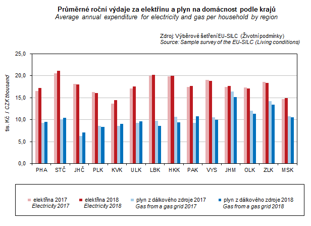 Graf 33. Průměrné roční výdaje za elektřinu a plyn na domácnost podle krajů