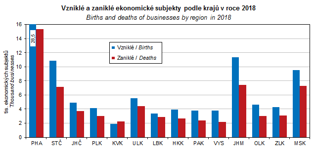 Graf 23. Vzniklé a zaniklé ekonomické subjekty podle krajů v roce 2018