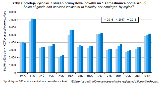 Graf 31. Tržby z prodeje výrobků a služeb průmyslové povahy na 1 zaměstnance podle krajů