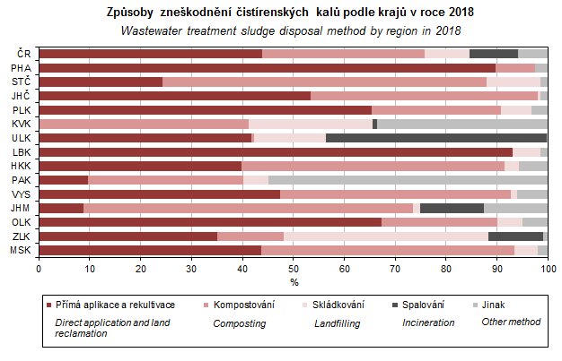 Graf 8. Způsoby zneškodnění čistírenských kalů podle krajů v roce 2018