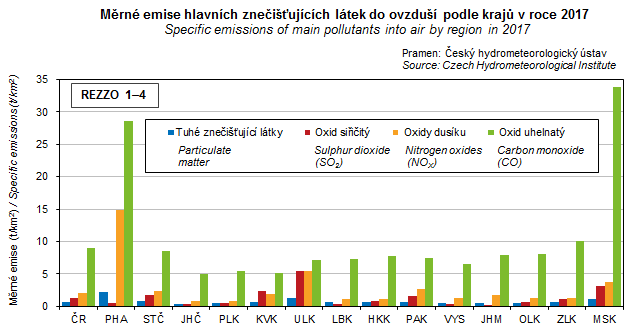 Graf 5. Měrné emise hlavních znečišťujících látek do ovzduší podle krajů v roce 2017