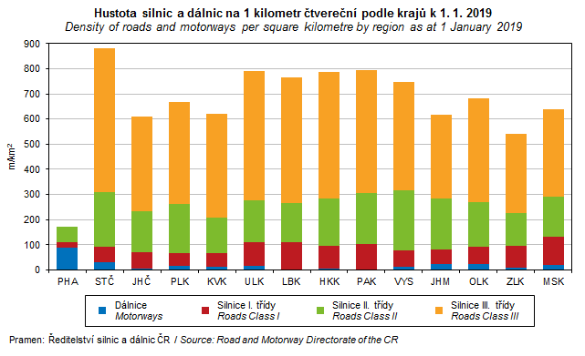 Graf 39. Hustota silnic a dálnic na 1 kilometr čtvereční podle krajů k 1. 1. 2019