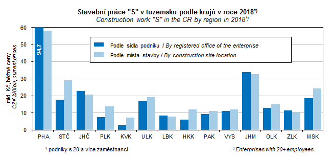 Graf 35. Stavební práce ˝S˝ v tuzemsku podle krajů v roce 2018