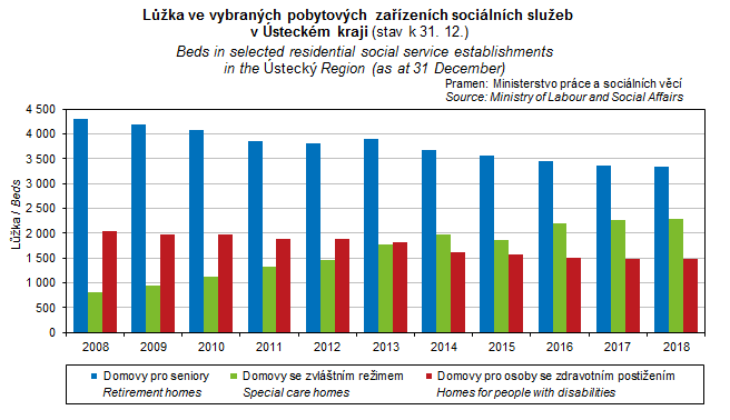 Graf 43. Lůžka ve vybraných pobytových zařízeních sociálních služeb v Ústeckém kraji
