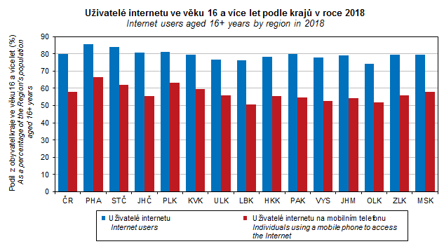 Graf 40. Uživatelé internetu ve věku 16 a více let podle krajů v roce 2018