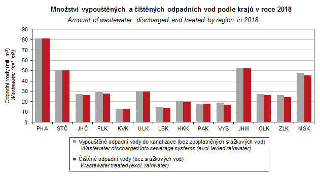 Graf 7. Množství vypouštěných a čištěných odpadních vod podle krajů v roce 2018