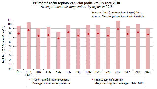 Graf 3. Průměrná roční teplota vzduchu podle krajů v roce 2018