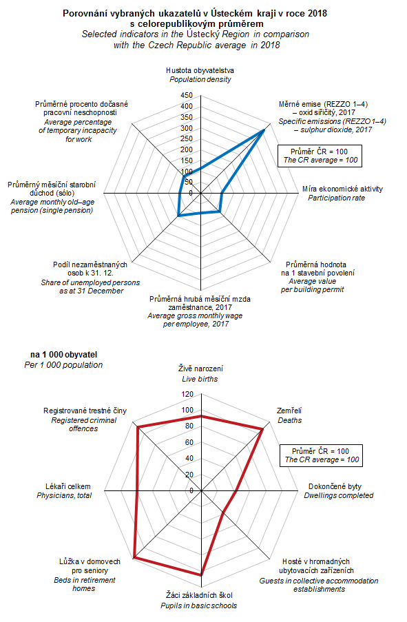 Graf 1. Porovnání vybraných ukazatelů v Ústeckém kraji v roce 2018 s celorepublikovým průměrem