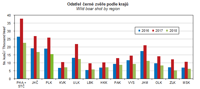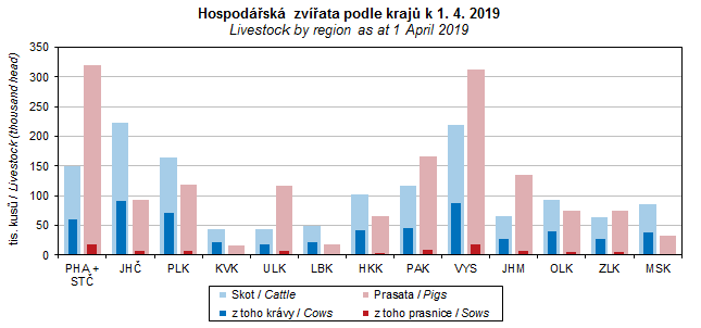 Graf 27. Hospodářská zvířata podle krajů k 1. 4. 2019