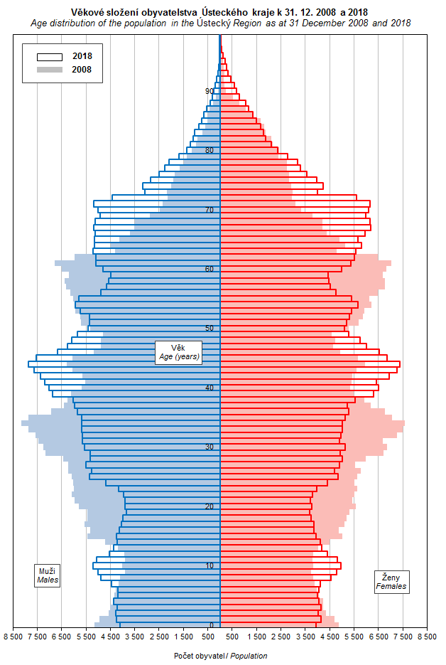 Graf 9. Věkové složení obyvatelstva Ústeckého kraje k 31. 12. 2008 a 2018