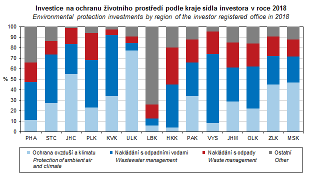 Graf 4. Investice na ochranu životního prostředí podle kraje sídla investora v roce 2018