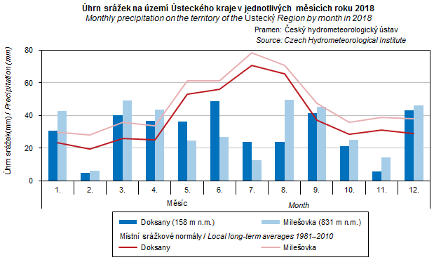 Graf 2. Úhrn srážek na území Ústeckého kraje v jednotlivých měsících roku 2018