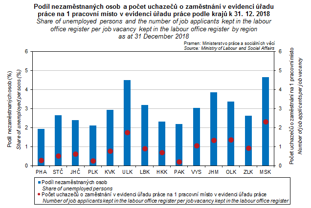 Graf 21. Podíl nezaměstnaných osob a počet uchazečů o zaměstnání v evidenci úřadu práce na 1 pracovní místo v evidenci úřadu práce podle krajů k 31. 12. 2018