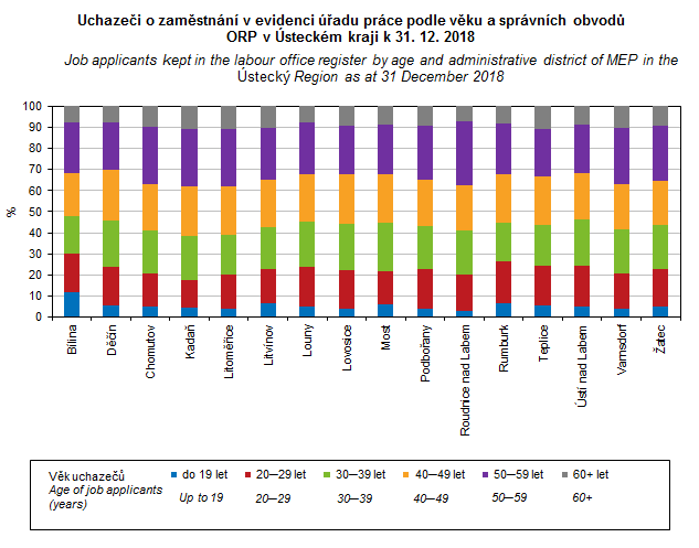 Graf 49. Uchazeči o zaměstnání v evidenci úřadu práce podle věku a správních obvodů ORP v Ústeckém kraji k 31. 12. 2018