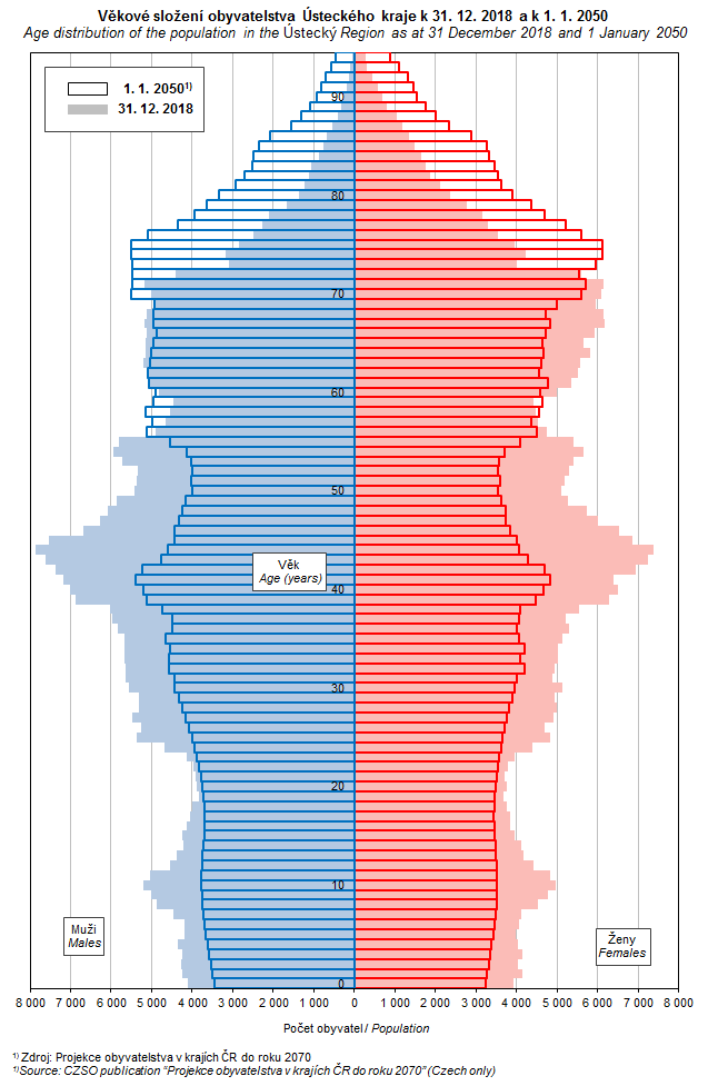 Graf 11. Věkové složení obyvatelstva Ústeckého kraje k 31. 12. 2018 a k 1. 1. 2050
