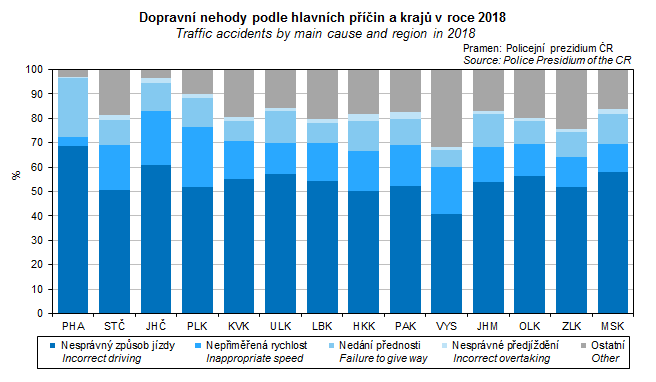 Graf 45. Dopravní nehody podle hlavních příčin a krajů v roce 2018