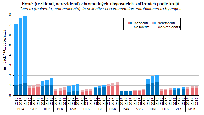 Graf 38. Hosté (rezidenti, nerezidenti) v hromadných ubytovacích zařízeních podle krajů