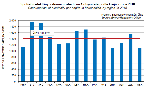 Graf 32. Spotřeba elektřiny v domácnostech na 1 obyvatele podle krajů v roce 2018