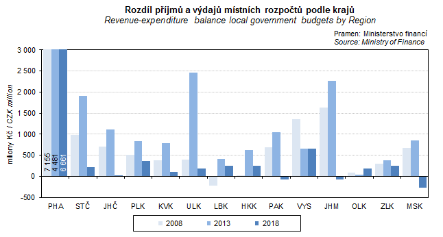 Graf 18. Rozdíl příjmů a výdajů místních rozpočtů podle krajů