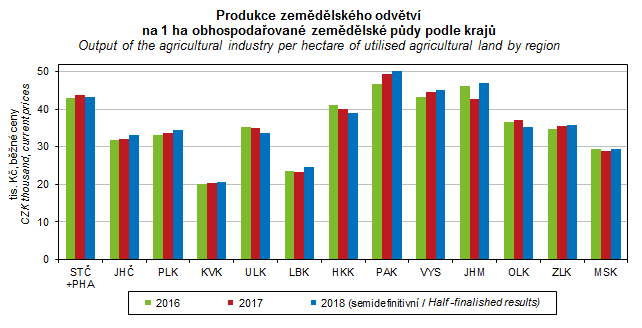 Graf 24. Produkce zemědělského odvětví na 1 ha obhospodařované zemědělské půdy podle krajů